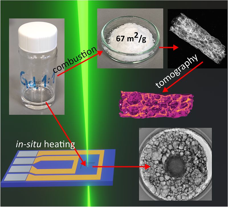 Abstract: Nanoscale gadolinium oxide (Gd2O3) is a promising nanomaterial with unique physicochemical properties that finds various applications ranging from biomedicine to catalysis. The preparation of highly porous Gd2O3 nanofoam greatly increases its surface area thereby boosting its potential for functional use in applications such as water purification processes and in catalytic applications. By using the combustion synthesis method, a strong exothermic redox reaction between gadolinium nitrate hexahydrate and glycine causes the formation of crystalline nanoporous Gd2O3. In this study, the synthesis of Gd2O3 nanofoam is achieved with combustion synthesis at large scale (grams). Its nanoscale porosity is investigated by nitrogen physisorption and its nanoscale 3D structure by electron tomography, and the formation process is investigated as well by means of in situ heating inside the transmission electron microscope. The bulk nanofoam product is highly crystalline and porous with a surface area of 67 m2 g−1 as measured by physisorption, in good agreement with the electron tomographic 3D reconstructions showing an intricate interconnected pore network with pore sizes varying from 2 to 3 nm to tens of nanometers. In situ heating experiments point to many possibilities for tuning the porosity of the Gd2O3 nanofoam by varying the experimental synthesis conditions.