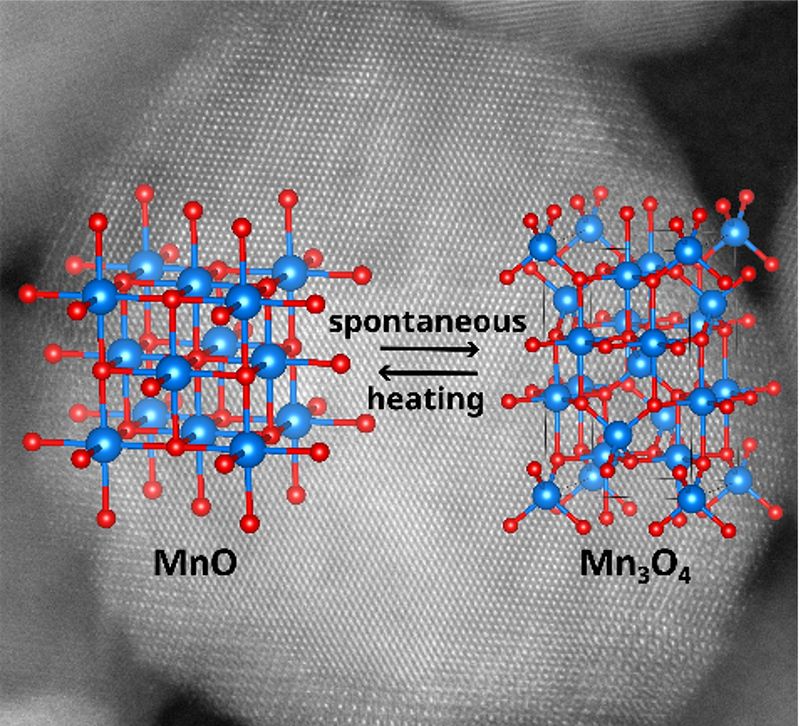 Abstract:  Manganese is an attractive element for sustainable solutions. It is largely available in the earth's crust, making it ideal for cost-effective and large-scale applications. Especially MnO nanoparticles have recently received attention for applications in battery technology. However, manganese has many oxidation states that are energetically very similar, indicating that they may easily transform from one to the other. Herein, the reversible oxidation of MnO nanoparticles to Mn3O4 studied with in situ transmission electron microscopy is shown. The oxygen sublattices of MnO and Mn3O4 are found to be perfectly aligned, and an atomic mechanism where the transformation is facilitated by the migration of Mn cations on the shared O sublattice is proposed. Even when protected with an amorphous carbon layer, MnO particles are highly unstable and oxidize to Mn3O4 in ethanol. The poor stability of MnO lacks discussion in many battery-related works, and strategies aimed at avoiding this should be developed.
